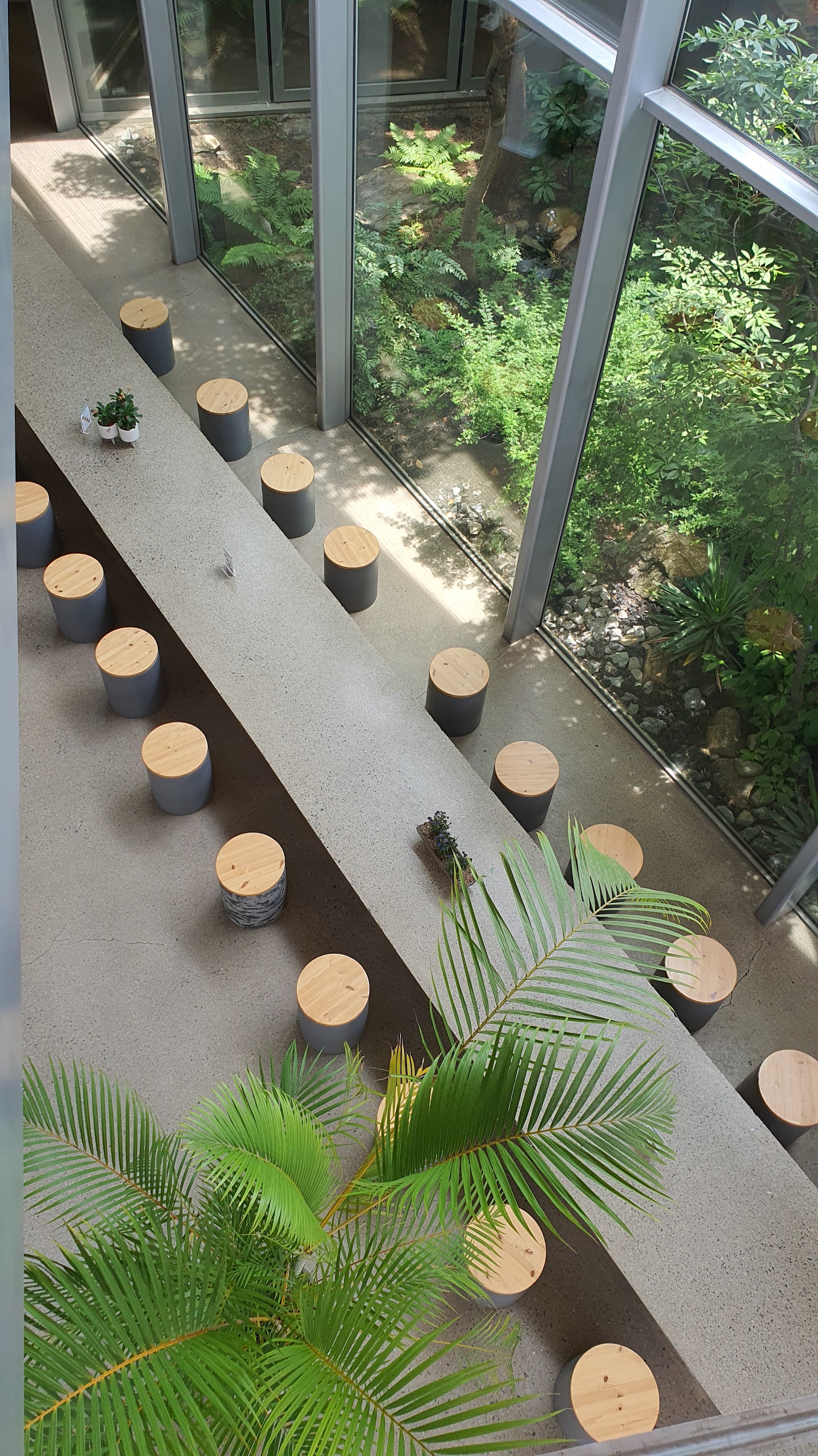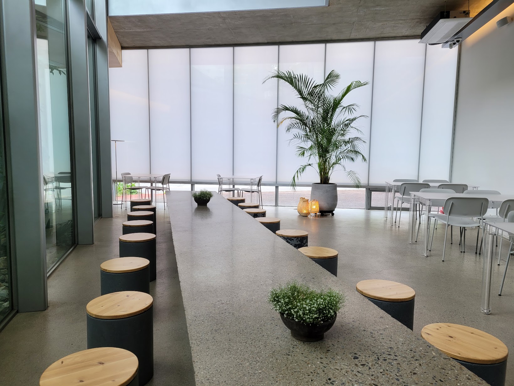 카페 외관부터 약간은 도회적이고 콘크리트 느낌이 강한데, 안으로 들어가면 훨씬 부드럽고 따뜻한 느낌이 강하다. 내부 구조는 복층으로 되어 있고, 가운데에는 중정이 있어 채광이 굉장히 좋다. 낮 시간대에 방문하면 햇살이 은은하게 내려앉는 모습이 정말 인상적이다. 특히 중정 주변 좌석은 자연광이 부드럽게 들어와 사진 찍기에도, 책 읽기에도, 조용히 머무르기에도 안성맞춤이다. 2층에는 야외 테라스가 마련돼 있어, 날씨가 좋은 날엔 밖에 앉아 바람 맞으며 커피 한잔 하기 딱 좋다.