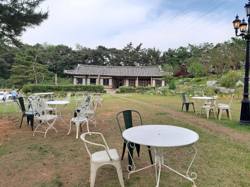 잔디밭과 나무, 그리고 한가운데 놓인 몇 개의 테이블.