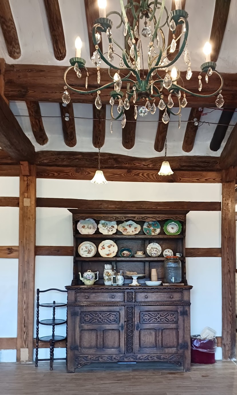 실내는 한옥 구조를 최대한 살린 공간이었는데, 천장엔 앤티크 샹들리에, 창문 옆에는 바스락거리는 레이스 커튼.