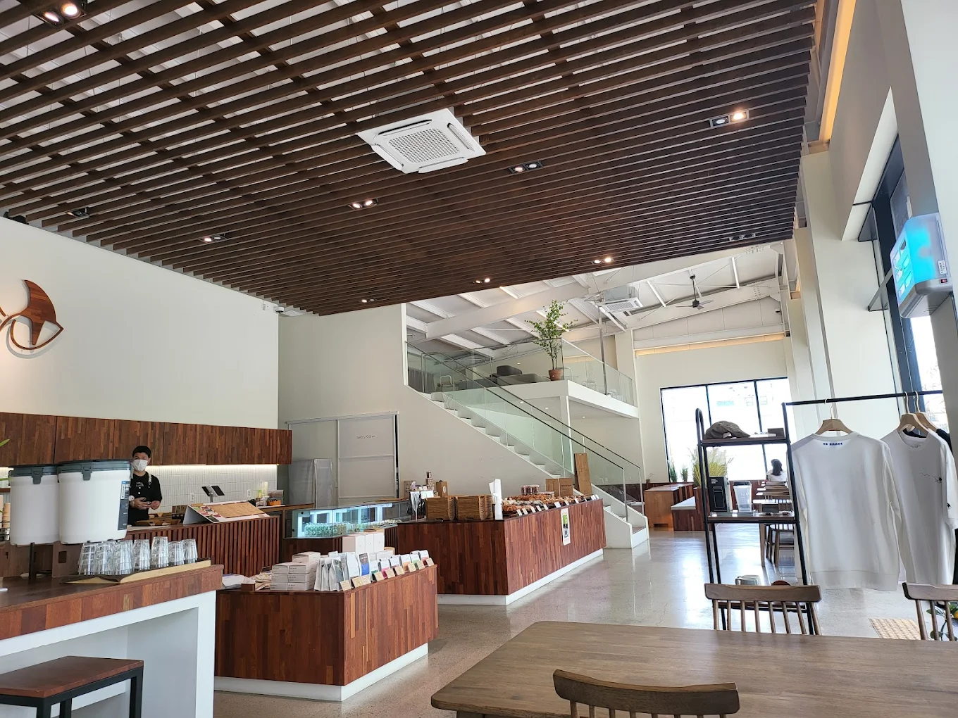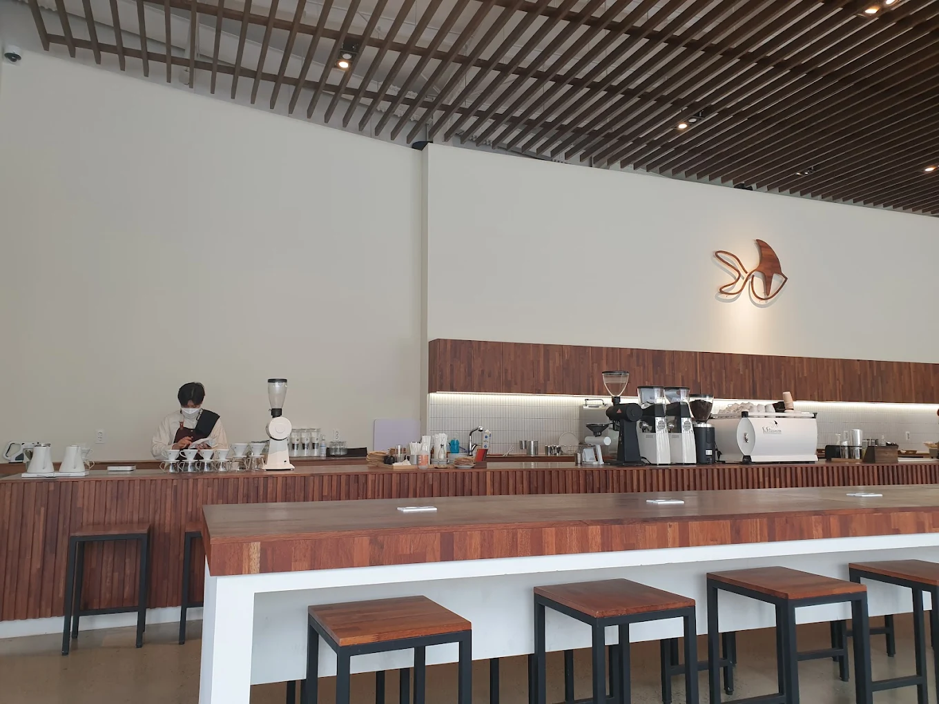 이 카페는 원래 제주 본점으로 유명한 곳이다. '제주에서 날아온 커피 감성'이라는 말이 과장이 아닌 게, 내부에 들어서면 천장이 탁 트이고 공간 전체가 흰색과 우드 톤으로 통일되어 있다. "아, 제주 느낌이란 게 이거구나" 싶다.