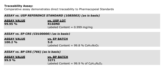 → 이 카페인 표준물질(CRM)은 전체 질량 중 99.97%가 순수한 카페인이라는 뜻입니다. 나머지 0.03%는 불순물, 수분, 잔류 용매 등일 수 있습니다.
