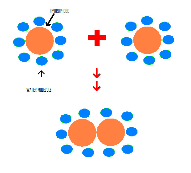 소수성 물질을 물에 녹였을 때 위 그림 같은 형태를 보입니다. 노란색은 소수성 물질, 파란색은 물을 나타냅니다. 소수성 물질끼지 뭉쳐있고, 그 곁을 물끼리 수소 결합을 이루어서 감싸는 형태입니다. 이러한 형태로 존재하는 이유는 엔트로피(entropy)의 증가로 설명합니다. 열역학 제2법칙에 따르면 엔트로피는 시간에 따라 증가합니다. 쉽게 말하면 무질서도가 커진다는 말입니다. 소수성 물질끼리 붙어 있으니 엔트로피가 작아진다고 생각하기 쉬운데 소수성 물질 하나를 물 분자가 감쌀 때 물 분자끼리 특정한 케이지 모양(clathrate cage)를 이루는데 구조를 이루면 엔트로피가 작아집니다. 하지만 소수성 물질끼리 붙어 있으면 이 케이지가 어느 정도 깨지기 때문에 엔트로피가 증가하게 됩니다. 우리는 이러한 작용을 소수성 상호작용(hydrophobic interaction)이라고 합니다.