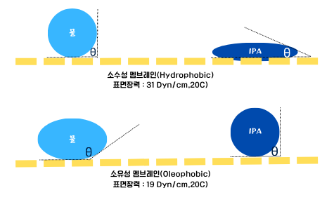 소유성(Oleophobic) 멤브레인은 19 Dyn/cm 표면장력을 가지고 있으며 약 20 Dyn/cm의 표면장력을 갖는 비극성 용매와는 약 90도 정도의 접촉각을 갖기 때문에 반발력이 생겨서 쉽게 적셔지지 않습니다 반면에 약 70 Dyn/cm의 표면 장력을 갖는 극성 용액 5% NACL과는 135도의 접촉각을 이루어 강한 반발력이 생겨서 쉽게 적셔지지 않습니다
