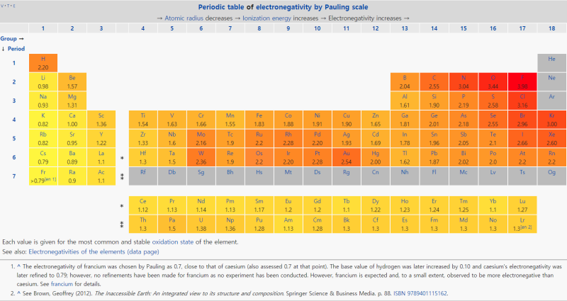 전기음성도는 원자나 분자가 화학 결합을 할 때 다른 전자를 끌어들이는 능력의 척도입니다. 이 특성도 결국 최외각 껍질과 원자번호에 의해 결정됩니다. 조금 어려운 개념이므로 주기율표에서 오른쪽 위로 갈수록 전기음성도가 강해지는 경향이 있다고 생각하시면 됩니다. 빨간색이 짙어질 수록 전기음성도가 강한 것을 말하는데 산소가 수소보다 전기음성도가 강합니다.