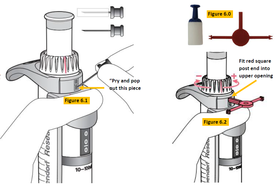 • 우선 피펫 상단의 조정 구멍을 덮고 있는 빨간색, 파란색 또는 회색의 ADJ 혹은 CAL 스티커를 조심스럽게 제거합니다. 이건 마치 '봉인 해제'와도 같은 느낌입니다.