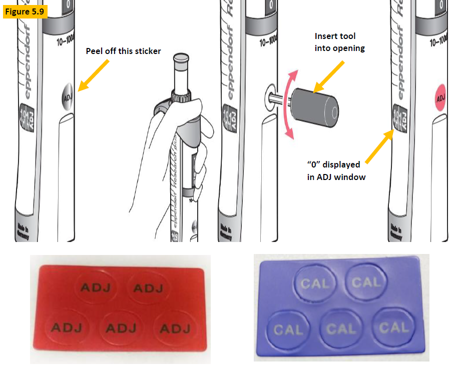 Figure 5.8을 보면 알 수 있듯이, 조정이 잘못된 경우 ADJ 창이 ‘0’을 벗어나 있을 수 있습니다. 만약 부피가 제대로 흡입되지 않는다면 단순히 팁을 잘못 장착했거나 피펫의 작동 방법이 틀렸을 수도 있지만, 그게 아니라면 이제 조정(adjustment) 단계로 들어가야 할 시간입니다.