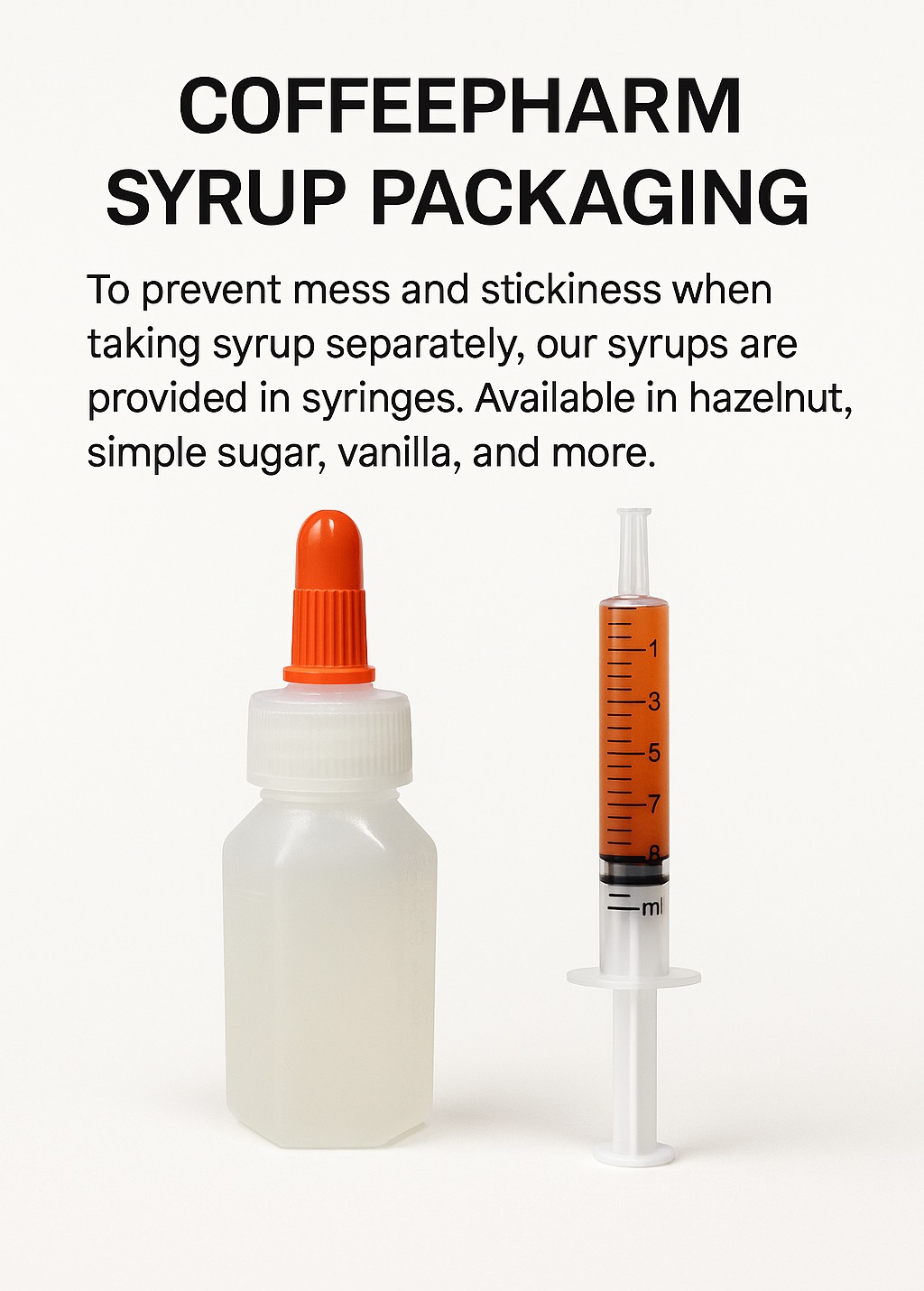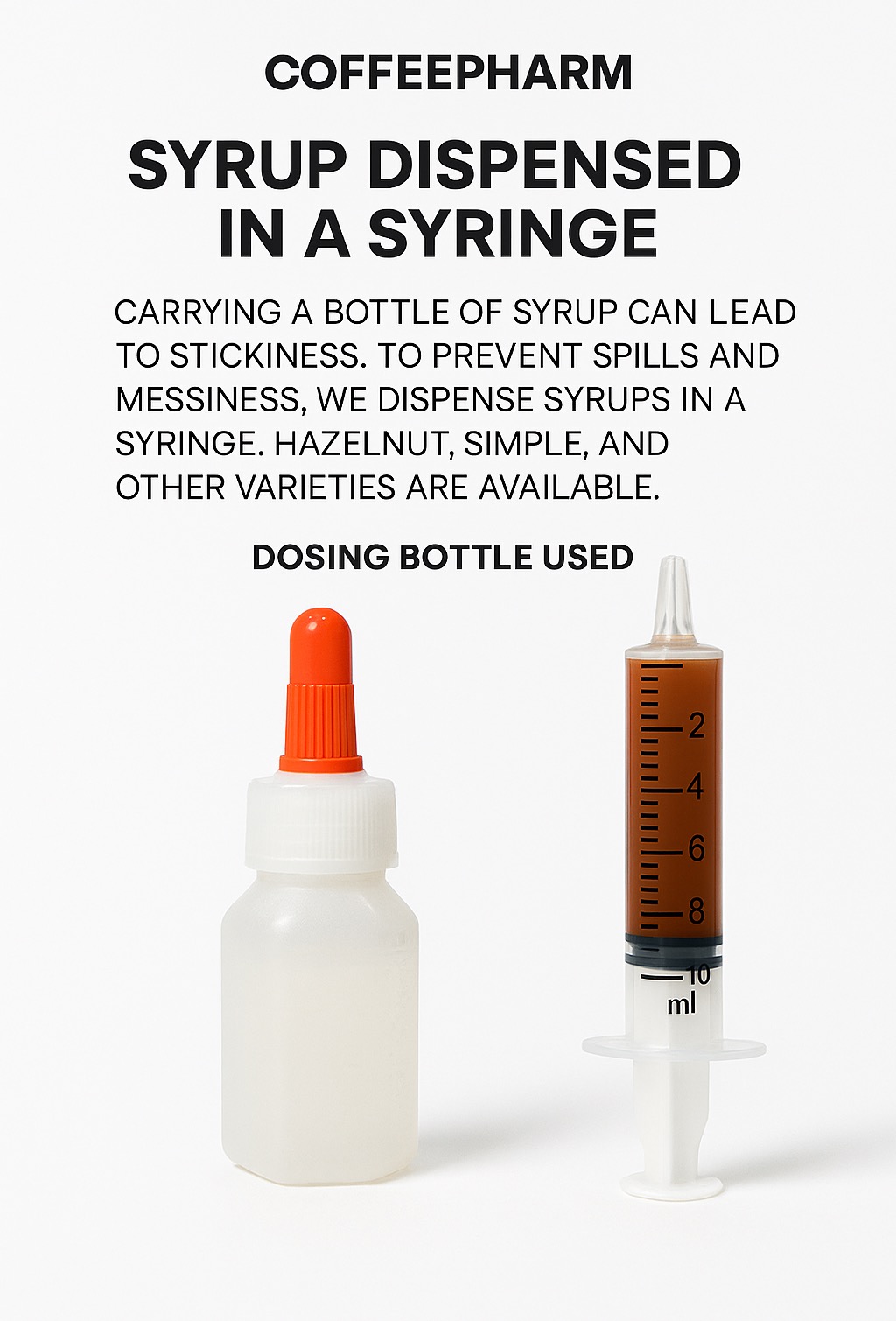제품은 크게 약국에서 볼 수 있는 투약병 형태와 주사기형 디스펜서 두 가지로 구성된다. 투약병은 30ml와 50ml의 컴팩트한 사이즈로 휴대성과 보관이 용이하며, 밀폐 구조로 시럽의 신선함과 위생을 유지한다. 주사기형 디스펜서는 0.5ml 단위까지 정밀한 계량이 가능해, 고객이 원하는 맛의 강도를 세밀하게 조절할 수 있도록 설계되어 있다. 이를 통해 한 잔 한 잔 커피의 맛을 일정하게 재현할 수 있다.