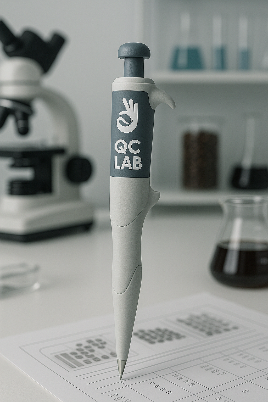 본 제품은 단순한 필기구가 아닌, 실험실의 정밀함과 제약·식품 품질관리의 이미지를 커피 문화와 결합한 상징적인 아이템으로 기획되었습니다. 소비자분들께서 커피를 즐기시는 순간에도 QC LAB의 브랜드 스토리와 세밀한 디테일을 느끼실 수 있도록 하는 것이 본 프로젝트의 핵심 목표입니다.