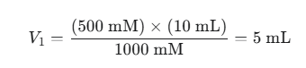우선, 염화칼륨의 최종 농도는 500 mM, 스톡 용액의 농도는 1000 mM이다. 최종적으로 10 mL의 버퍼를 만들고자 한다면, 공식은 다음과 같이 적용된다.