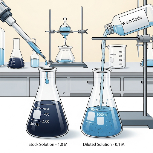 다른 상황으로, 아주 진한 16M의 질산 스톡 용액을 가지고 0.50M 농도의 질산 용액 8.00L를 만들고 싶다고 해보자. 이 경우, 필요한 스톡 용액의 부피()를 찾아야 한다. 공식을 변형하여 으로 계산하면, 가 된다. 즉, 250mL의 스톡 질산 용액을 취해 여기에 물을 더해 최종 부피가 8.00L가 되도록 만들면 된다는 것이다. 이 과정은 소량의 용질을 정밀하게 측정하는 것보다 훨씬 용이하며, 실험의 정확성을 높일 수 있는 실용적인 방법이다.