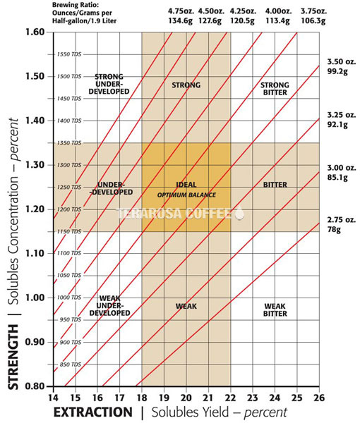 아래 표는 각 대륙마다의 농도의 선호도를 나타낸 커피 브루잉 컨트롤 차트(Coffee brewing control chart)의 일부로, 1950년부터 커피 브루잉에 관한 연구가 미국에서 시작되어 여러 기관을 거쳐 완성된 것이 지금의 표다.