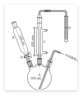 · 물 150mL를 삼구증류플라스크(A)에 넣고, 원통형 분액깔때기(B)의 코크(E)를 닫습니다.