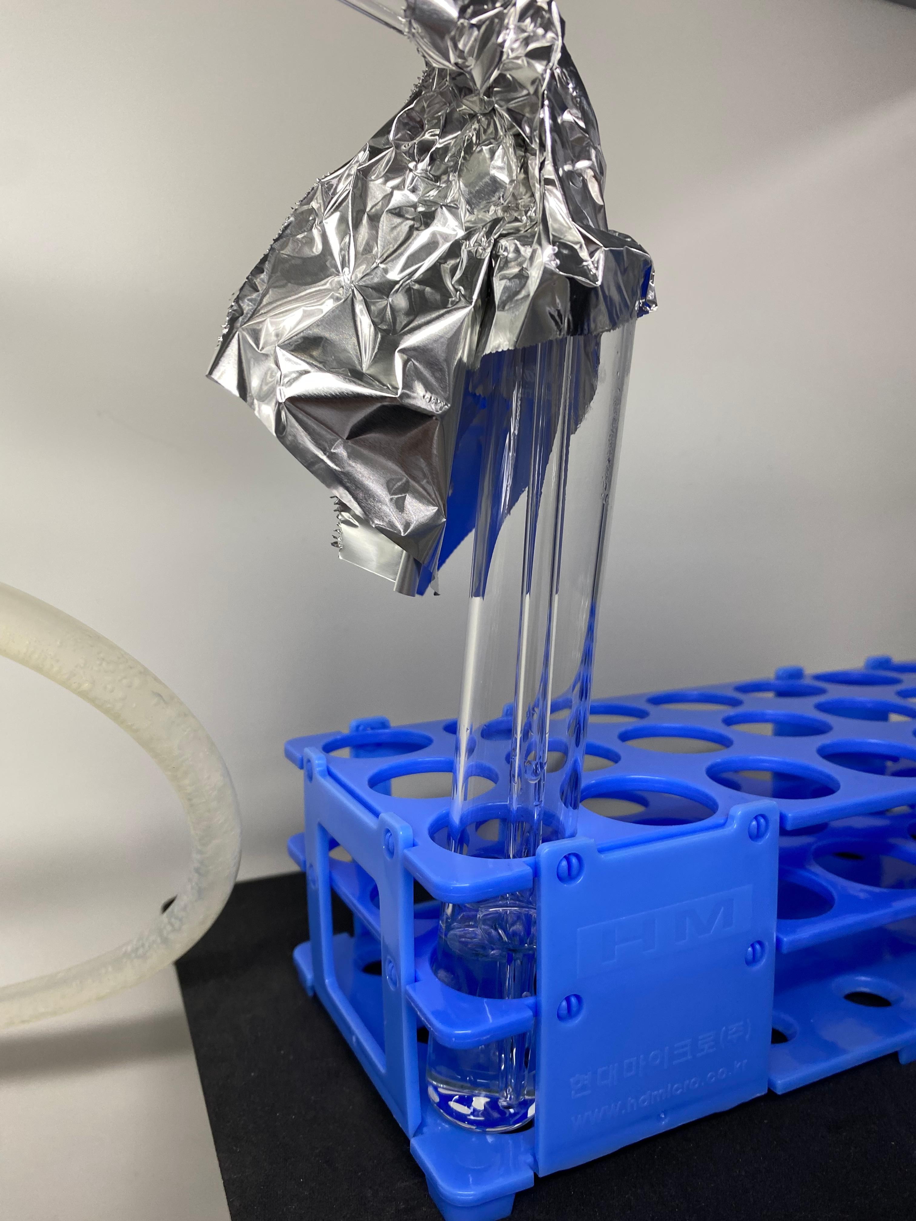 적정 전에는 노란색이었다가 청자색으로 변하였다. 적정은 종말점 색이 중요하니까 공유한다.