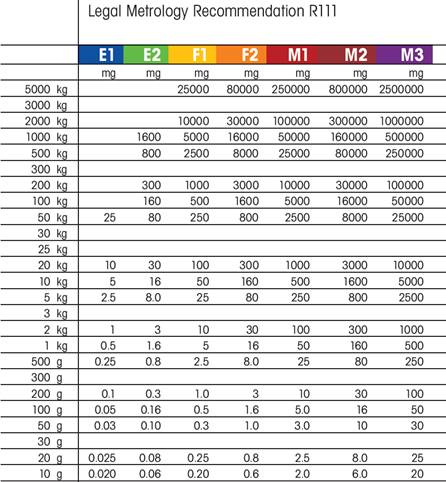 - 미국 표준 ANSI/ASTM E617에 기술된 허용오차와 제작방법이 적용된 분동을사용