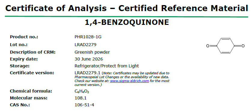 1,4-benzoquinone (1,4-벤조퀴논) 공인 표준물질(CRM, Certified Reference Material) 분석증명서(CoA) 리뷰