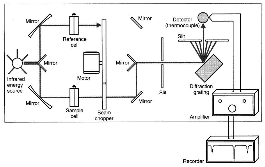 적외선 분광기는 본질적으로 화합물이 적외선 영역의 빛을 얼마나 흡수하는지를 측정하는 기기다. 유기화학 실험실에서 주로 사용하는 적외선 분광기는 분산 방식(dispersive)과 푸리에 변환 방식(FT-IR) 두 종류로 구분된다. 두 방식 모두 4000에서 400 cm⁻¹ 범위에서 스펙트럼을 얻지만, 데이터 처리와 분석 속도에서 큰 차이를 보인다.