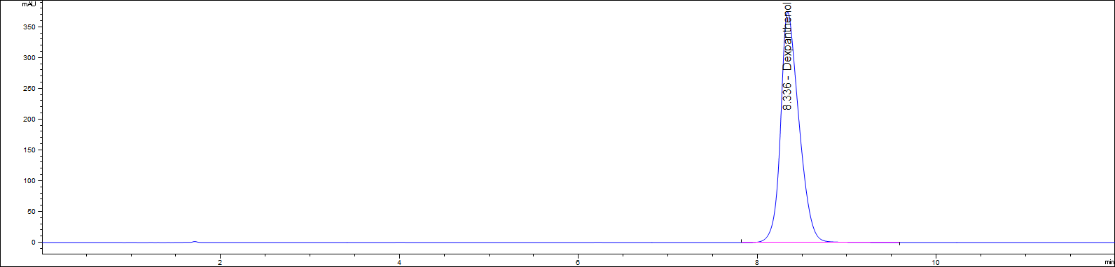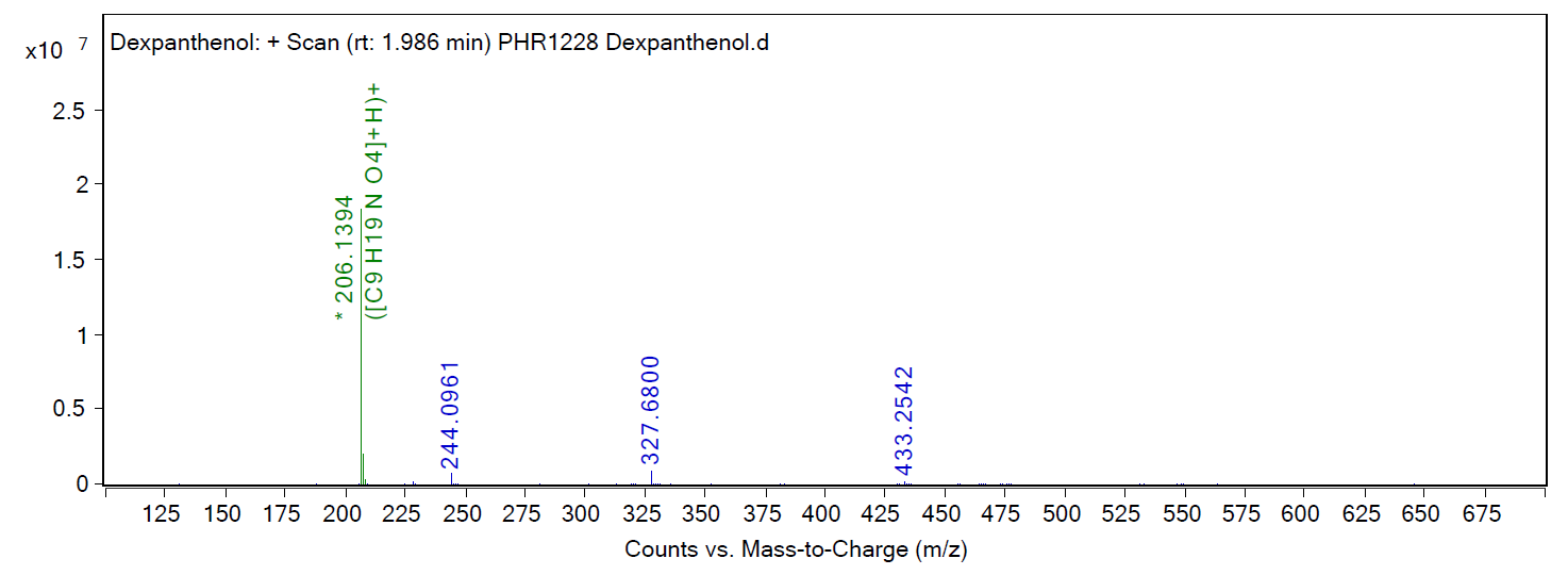 적외선 분광법(IR spectroscopy)을 이용하여 USP Reference Standard의 스펙트럼과 비교한다. Dexpanthenol 특유의 C=O 신호(약 1,650 cm⁻¹ 부근)와 -OH 신호(약 3,400 cm⁻¹ 부근)가 일치해야 한다.