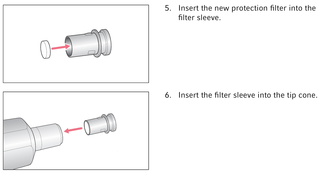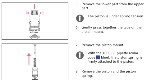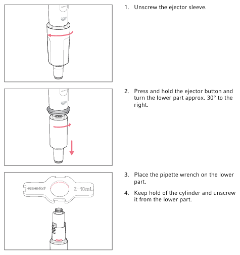 5 ml 피펫을 분리하고 조립할 때 먼저 3번 4번을 결합하고 2번 스프링을 넣고 1번과 4번을 결합 후 90도 틀어 고정시킨다.