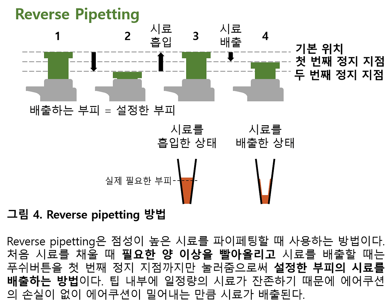 이런 문제점을 해결할 수 있는 파이페팅 방법이 있는데 이를 Reverse pipetting이라고 합니다 (그림 4). 이와는 반대 개념인 Forward pipetting이라 하면 푸쉬버튼을 두 번째 정지지점까지 눌러서 처음 빨아들인 시료를 완벽하게 배출하는 방식을 의미합니다 (그림 3). 반면 Reverse pipetting은 간단하게 말해서 ‘필요한 것보다 많은 양의 시료를 빨아들인 후 원하는 만큼만 배출’하는 방식을 의미합니다. 다르게 말하면 ‘내가 설정한 시료의 부피는 처음 빨아들인 부피가 아니라 배출되는 부피와 같다’는 전제를 하는 것입니다. 처음 시료를 빨아들일 때는 푸쉬버튼을 두 번째 정지지점까지 누른 상태에서 빨아들이고, 이후에 배출할 때는 첫 번째 정지지점까지 누름으로써 시료의 점성과 상관없이 에어쿠션의 부피만큼에 해당하는 시료가 배출되게 됩니다 (그림 4). 팁 내부에 시료의 양이 필요 이상으로 존재하기 때문에 시료를 배출하여도 여전히 팁 내부에 일정량의 시료가 남아있음으로 인해 에어쿠션이 새어나가지 않고 해당 부피만큼 시료가 배출되는 것입니다. 따라서 점성이 있는 시료는 Reverse pipetting 방법을 사용해야 오차를 줄일 수 있습니다.