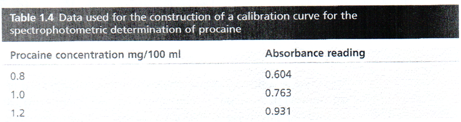 a는 y축의 절편이고 b는 기울이다. 간단한 예로 프로카인 농도에 따른 흡광도를 통해 3 점의 calibration curve가 작성된다 (Table 1.4).