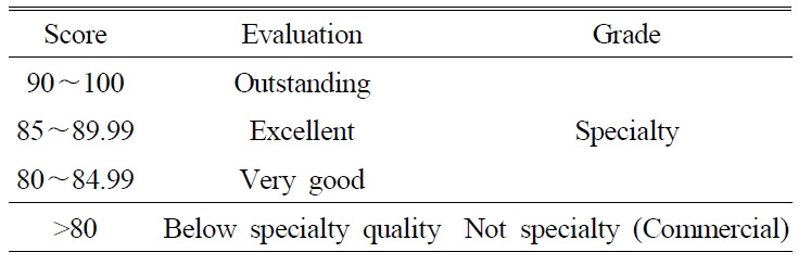 이에 미국 스페셜티 커피협회(SCAA)에서는 결점두의 함량과 커피의 전통적인 관능평가 방법인 커핑(cupping)을 통해서 향미를 평가하여 등급을 분류한다. SCAA에서는 350 g의 생두에서 결점두의 항목을 두 가지로 분류하여서 평가하는 방법을 사용하고 있다(Table 1). 첫번째 분류(category 1 defects)에서 결함이 없는 것으로 평가되고, 두번째 분류(category 2 defects)에서는 결함 항목이 5개 이하이고, 결함이 2점 이하일 경우에만 스페셜티 등급으로 평가를 받는다(SCAA 2009). 커핑(cupping)은 커피 농장 및 무역에서 전문가들이 사용하는 관능평가 방법으로(Farah 등 2006) SCAA에서는 정확한 품질 평가를 위해서 일정한 교육과 인증시험을 통과한 사람들을 대상으로 큐그레이더(Q-grader) 인증을 하고 있으며, 인증을 받은 사람들은 SCAA의 방법에 준해서 커피 품질을 평가할 수 있다. 평가는 SCAA의 커핑 평가지(Fig. 1)를 사용하고, 평가 항목은 향기(fragrance/aroma), 향미(flavor), 신맛(acidity), 후미(aftertaste), 바디감(body), 균형감(balance), 컵 간의 균일함(uniformity), 결점두 혼입 여부(clean cup), 단맛의 차이(sweetness), 종합 평가(overall)의 10개 항목이다. 이 중에서 향기(fragrance/aroma), 신맛(acidity), 바디감(body) 세 항목은 강도와 기호도를 동시에 평가하게 된다. 커핑을 통해서 평가된 총점이 80점 이상이면 스페셜티(specialty), 80점 미만이면 커머셜(commercial) 등급으로 평가된다(Table 2).