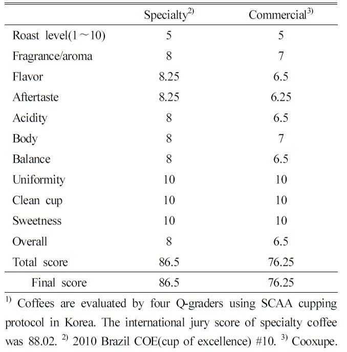 2010년에 브라질에서 생산된 커머셜 등급과 스페셜 등급을 (주)스페셜티커피에서 구입하였다. 구입할 때 큐그레이더 (Q-grader) 4인에 의해 평가된 결과의 평균값을 제공 받았으며, 결과는 Table 3과 같다.