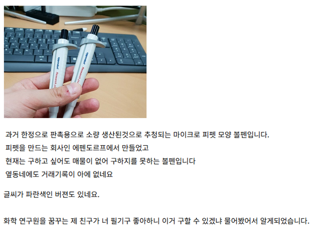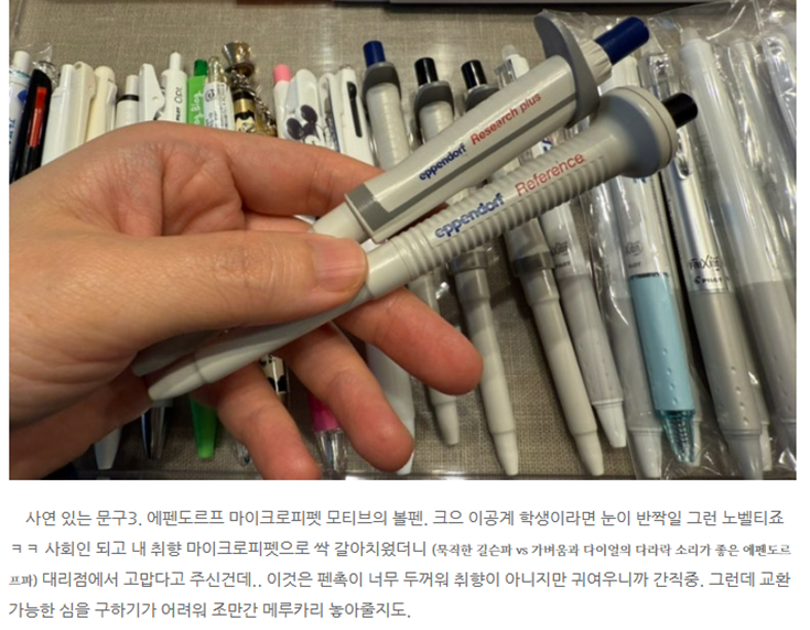 - 마이크로피펫 볼펜(피펫 펜)은 단순 문구가 아니라 연구자 커뮤니티에서 정체성과 소속감을 표현하는 수단으로 충분히 자리 잡고 있다.