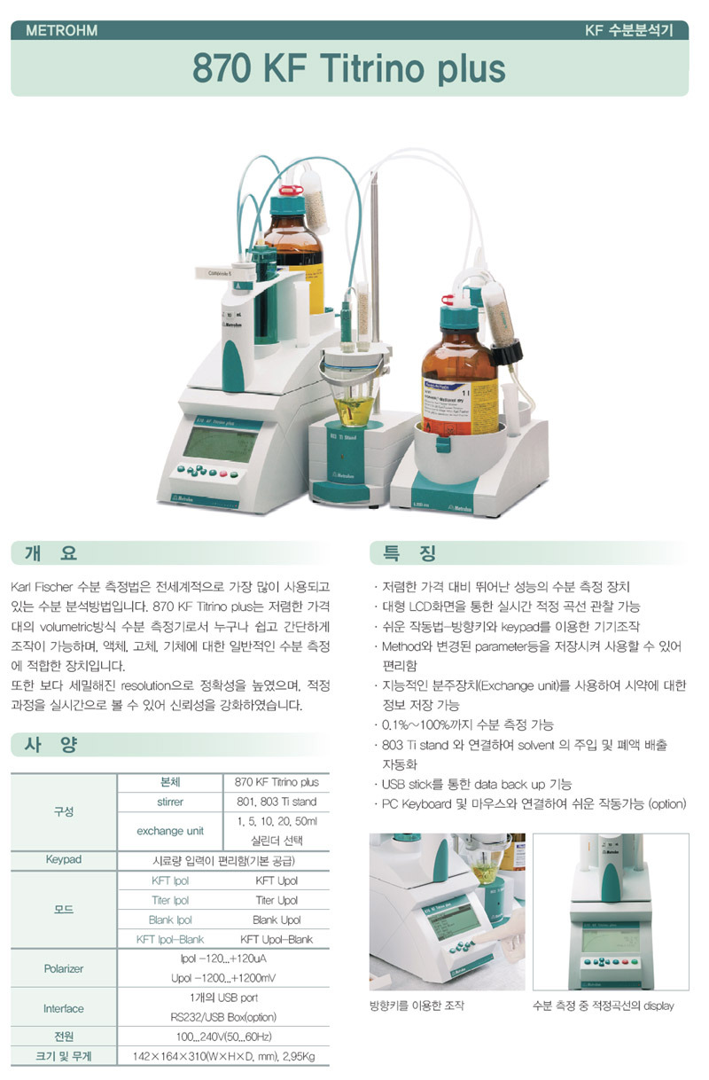 Metrohm 870 KF Titrino plus는 정밀한 수분 분석을 위해 설계된 자동 적정기입니다. 다양한 시료의 수분 함량을 효율적이고 정확하게 측정할 수 있도록 최적화된 기능을 제공합니다. 이 설명서는 사용자가 기기를 안전하고 효과적으로 사용할 수 있도록 필요한 모든 정보를 담고 있습니다.