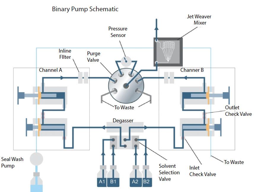 펌프는 일정한 유속으로 이동상을 보내는 핵심 장치다. 일반 분석에서는 4채널을 혼합하는 quaternary pump가 널리 사용된다. 반면 binary pump는 두 개의 독립 펌프가 혼합기로 연결되는 구조로, preparative 분석에서 자주 활용된다.