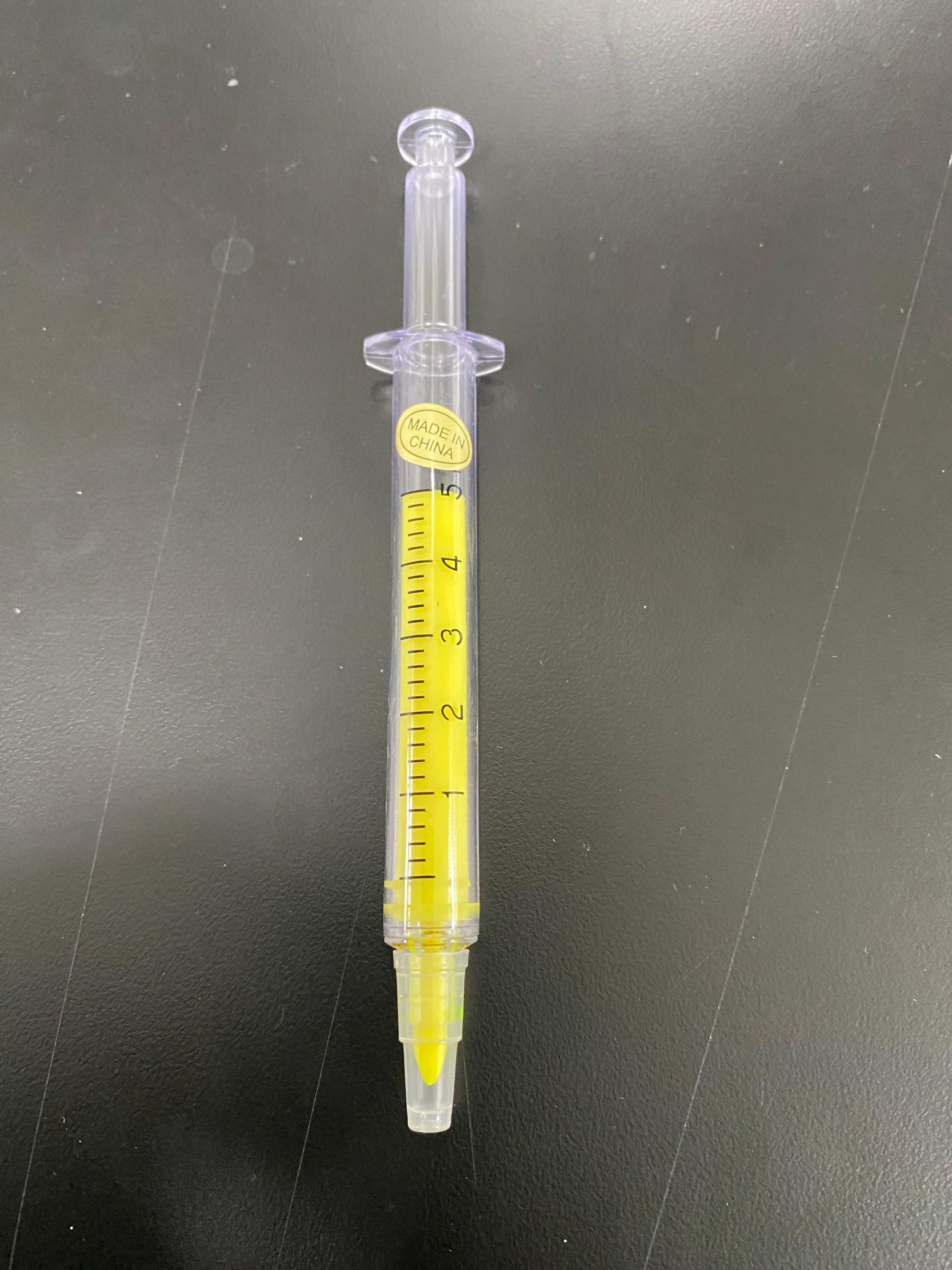 반면 주사기 형광펜은 성격이 다르다. 주사기 모양 문구류는 이미 오래전부터 존재하는 전형적인 노벨티 상품이다. 해외에서도 병원이나 간호 관련 행사에서 주사기 모양 펜이나 형광펜을 대량으로 판매하거나 배포하는 경우가 흔하며, 색깔별로 여러 개 묶어 판매되는 상품도 많다.
