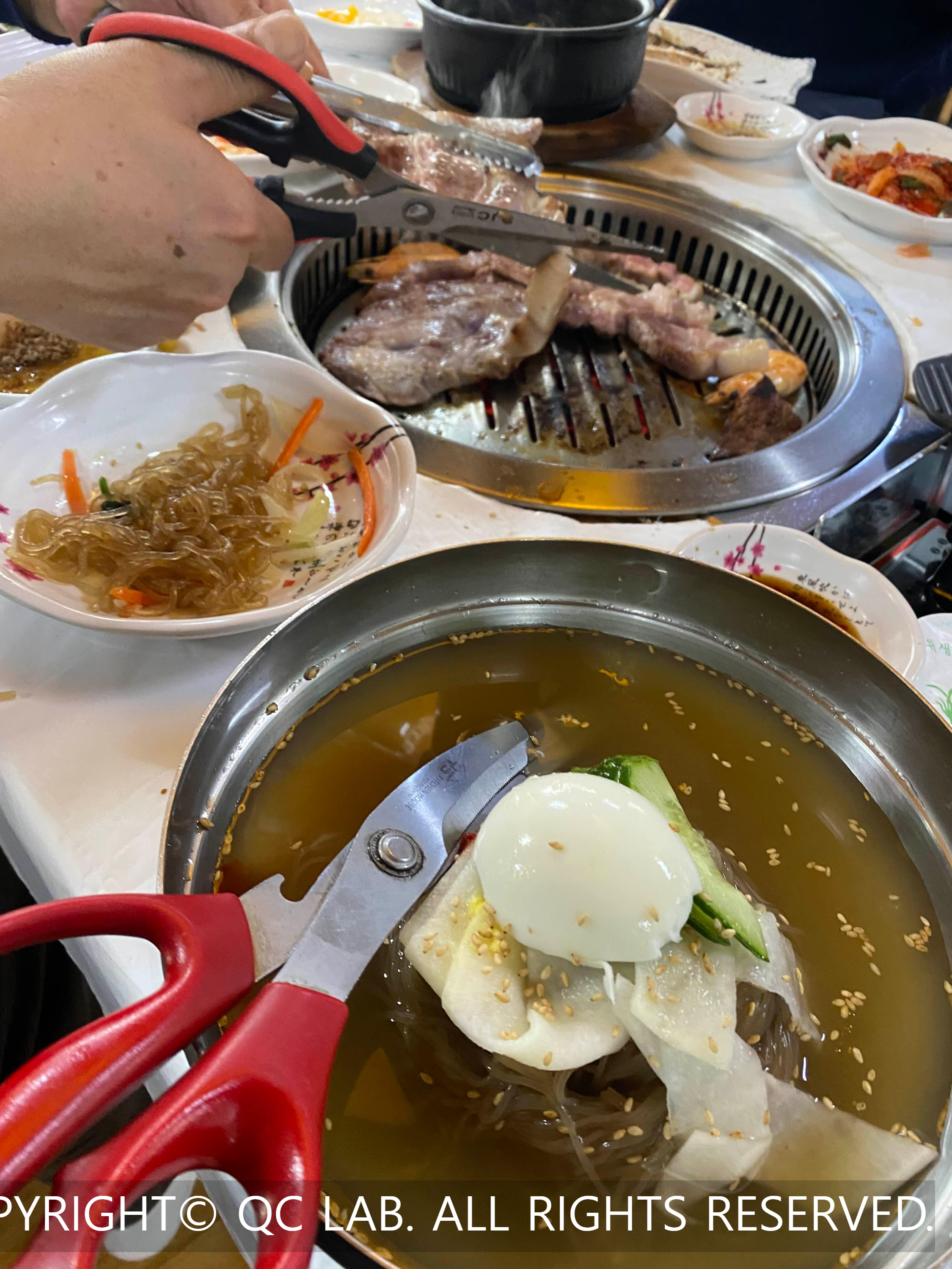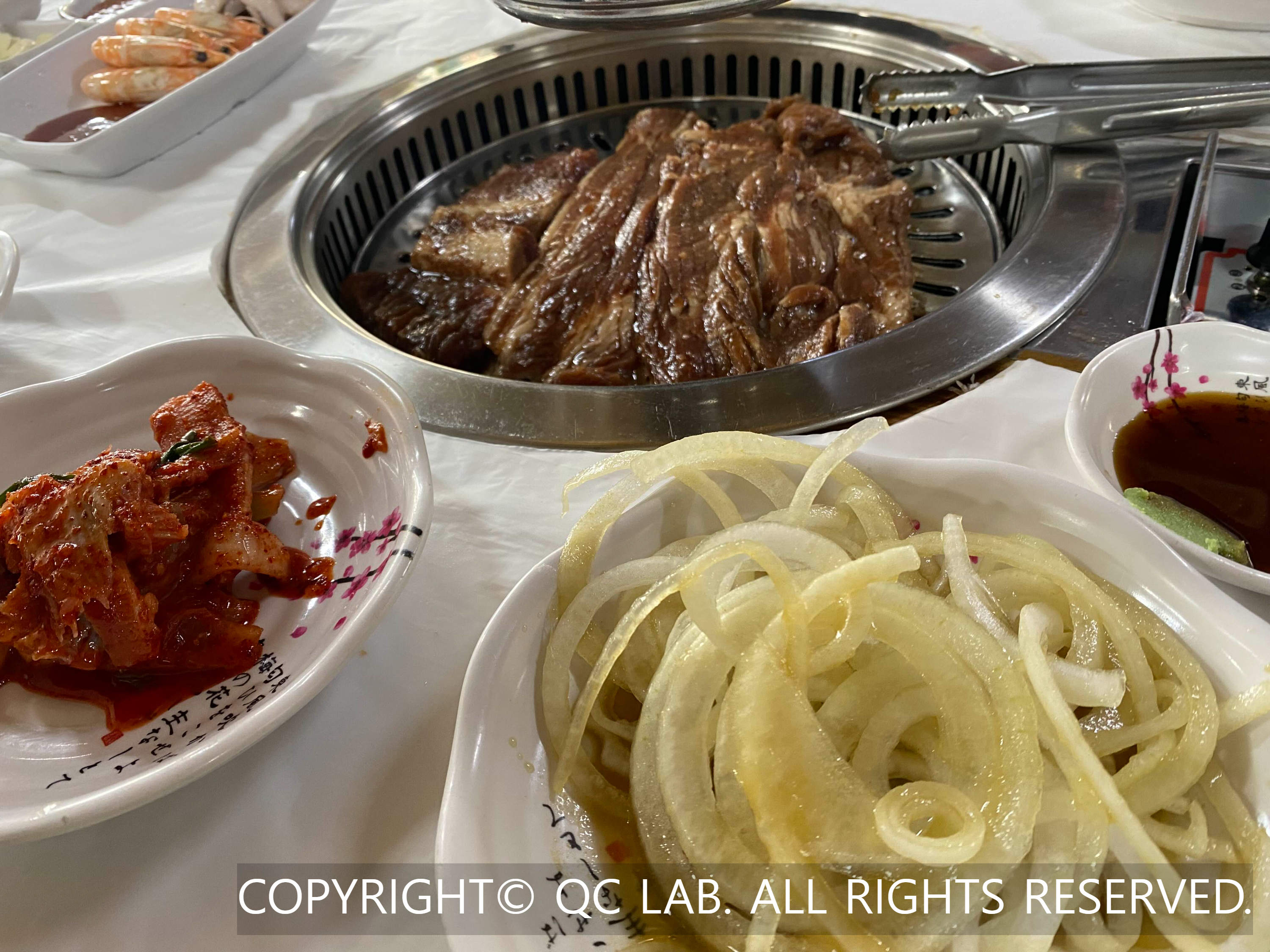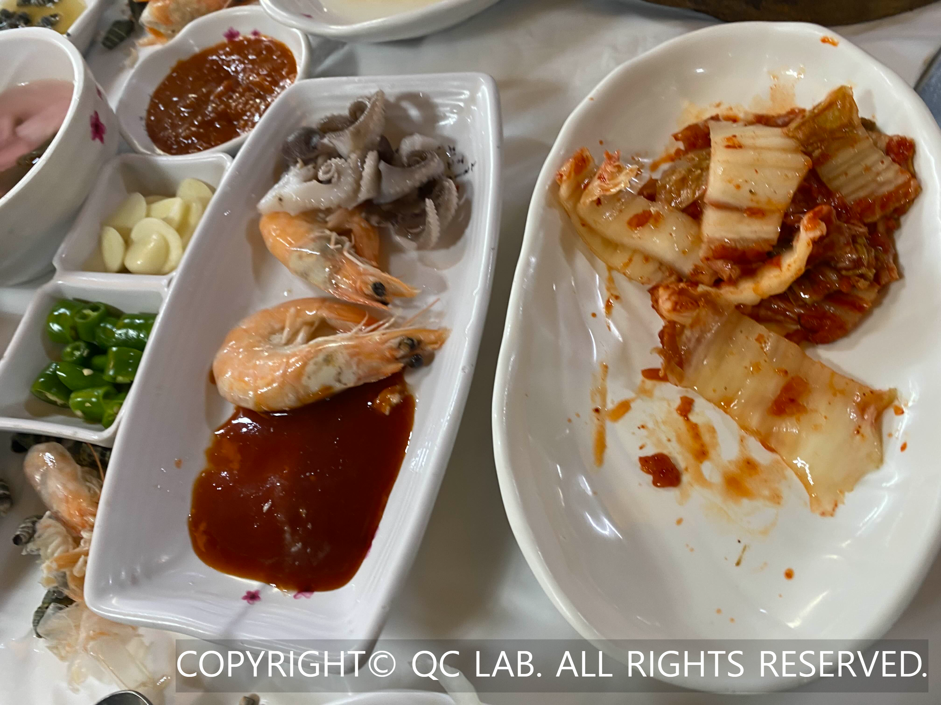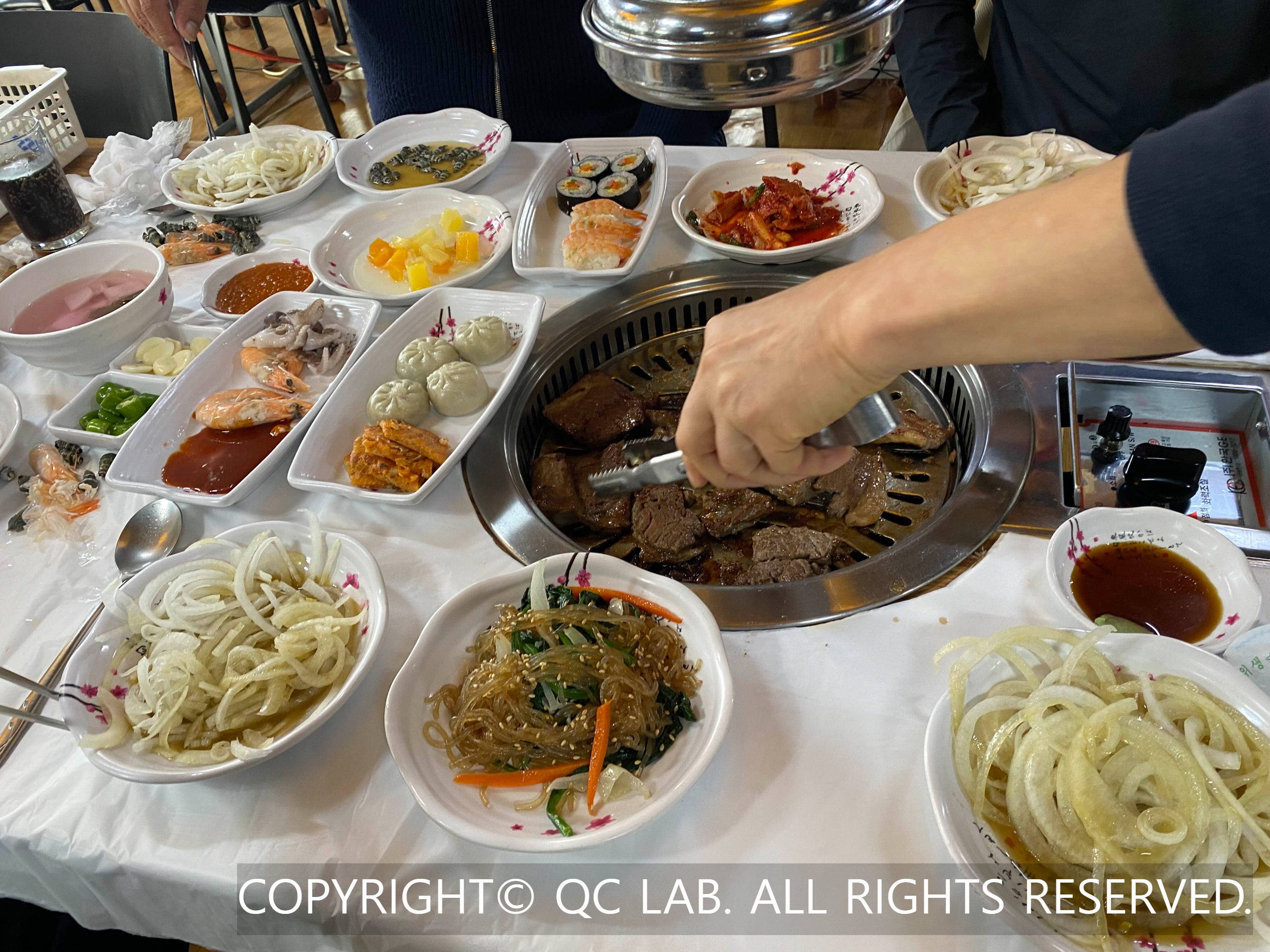 자리에 앉아 주문을 마치면 상다리가 휘어진다는 말이 무엇인지 실감하게 된다. 일반적인 고깃집과는 차원이 다른 반찬들이 줄지어 나오는데, 양념게장, 홍어무침, 동치미 같은 기본 찬은 물론이고 새우초밥, 김밥, 만두, 전, 심지어 쭈꾸미와 콘치즈까지 등장한다.