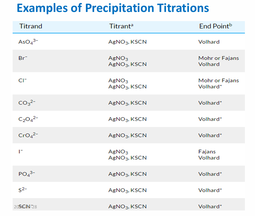 Since the end point does not exactly coincide with the equivalence point, the titrant should the standardized by the same titration as used for the sample (this eliminates the inherent error). Photodecomposition of AgCl, creating a purple-black hue on top of the white AgCl, is another source of error. It should be minimized by carrying out the titration expeditiously and in relative low light. As explained above, a colloidal precipitate is preferred in this titration. At the equivalence point, neither titrant nor titrate ions are in excess, and the precipitate is momentarily without a surface charge. This causes the colloidal particles to coagulate, thereby reducing the precipitate surface area. It can be prevented by the addition of a small amount of dextrin (hydrolyzed starch) to the solution.