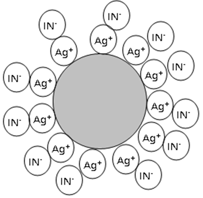 Beyond the equivalence point, Ag+ is in excess and the surface of the precipitate becomes positively charged, with the primary layer being Ag+. These positively charged colloidal particles will now attract the indicator anion and adsorb it into secondary adsorption layer.